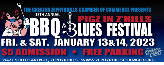 ![]() (ZEPHYRHILLS, FL) – The 13th Annual Pigz in Z’Hills BBQ & Blues will be held Jan 13 from 5-9pm and Jan 14 from 10am-6pm at 39421 South Avenue, Zephyrhills, Florida (across from the Zephyrhills Municipal Airport). This annual event benefits local youth and education programs. There’s something for everyone at this fun, family event… blues concerts, BBQ, vendors, kidz zone, cornhole tournament, and more! The Zephyrhills Annual Pigz in Z’Hills BBQ & Blues Festival is the Greater Zephyrhills Chamber of Commerce signature event. As the name suggests, BBQ & Blues features a friendly BBQ competition amidst a background of the blues music. Fri, Jan 13th will feature Vendors, Cornhole, Kidz Grillin’ Competition, and a live Blues Concert (6-9pm). Admission is $5 per person, and kidz under 42” no cover. Sat, Jan 14th features Vendors all day 10am-6pm, the Military History Museum 11am-5pm, a Cornhole Tournament, Well Seasoned: 12pm, Still Marinating: 2pm, a Business Exp, and a live Blues Concert (12-5pm). Admission is $8 per person, and kidz under 42” no cover. No coolers, and service animals only are permitted. Parking is free. Drive-In and enjoy great BBQ & Blues. |