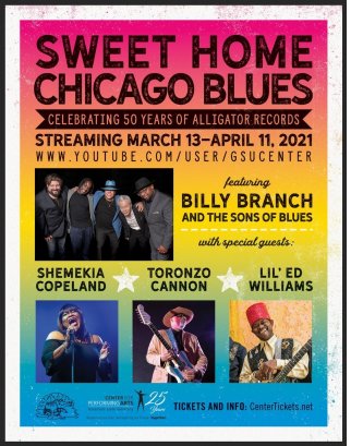 |  (UNIVERSITY PARK, IL) – Governors State University (GSU) Center for Performing Arts (the Center) will celebrate Chicago blues and Chicago-based Alligator Records’ 50th anniversary by presenting an online streaming video concert starring four of the label’s most popular artists. “Sweet Home Chicago – An Online Blues Celebration” will feature a performance by legendary harmonica player Billy Branch with his all-star band, The Sons Of Blues, with three special guests – Grammy-nominated vocalist Shemekia Copeland, slide guitar master Lil’ Ed Williams, and beloved Chicago blues guitarist and songwriter Toronzo Cannon. Alligator Records founder and president Bruce Iglauer will serve as Emcee. The once-in-a-lifetime event will be recorded on the Center’s stage to its empty 1,171 seat house. This concert is part of the Center’s 25th anniversary celebration. The show will debut as a ticketed streaming event at 7pm Central time on March 13, 2021, and will be available to watch on demand through April 11. The event will stream on the Center’s YouTube channel. For tickets and more information, click here. |