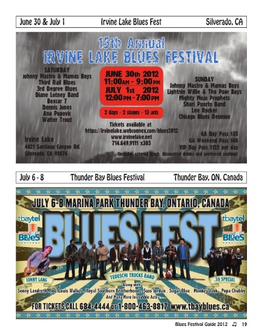June 30 & July 1 Irvine Lake Blues Fest Silverado, CA July 6 - 8 Thunder Bay Blues Festival Thunder Bay, ON, Canada Blues Festival Guide 2012 19