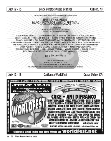 July 12 - 15 Black Potatoe Music Festival Clinton, NJ July 12 - 15 California WorldFest Grass Valley, CA 24 Blues Festival Guide 2012