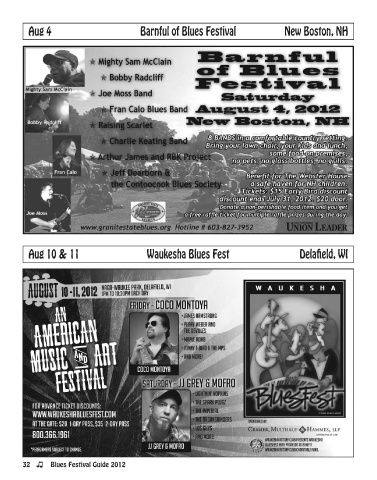 Aug 4 Barnful of Blues Festival New Boston, NH Aug 10 & 11 Waukesha Blues Fest Delafield, WI 32 Blues Festival Guide 2012