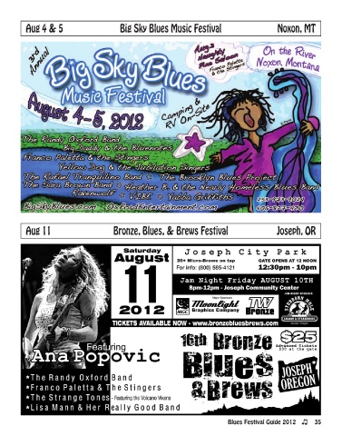 Aug 4 & 5 Big Sky Blues Music Festival Noxon, MT Aug 11 Bronze, Blues, & Brews Festival Joseph, OR Blues Festival Guide 2012 35