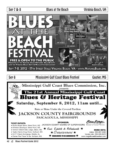 Sep 7 & 8 Blues at the Beach Virginia Beach, VA Sep 8 Mississippi Gulf Coast Blues Festival Gautier, MS 42 Blues Festival Guide 2012