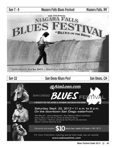 Sep 7 - 9 Niagara Falls Blues Festival Niagara Falls, NY Sep 22 San Diego Blues Fest San Diego, CA Blues Festival Guide 2012 45