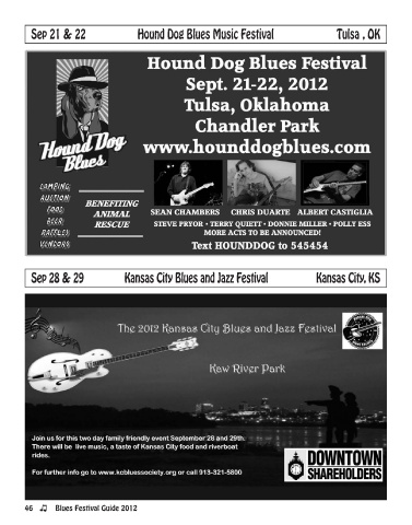 Sep 21 & 22 Hound Dog Blues Music Festival Tulsa , OK Sep 28 & 29 Kansas City Blues and Jazz Festival Kansas City, KS 46 Blues Festival Guide 2012