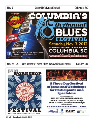 Nov 3 Columbia’s Blues Festival Columbia, SC Nov 23 - 25 Otis Taylor’s Trance Blues Jam-Workshop Festival Boulder, CO 52 Blues Festival Guide 2012