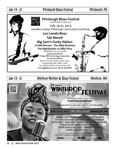 July 19 - 21 Pittsburgh Blues Festival Pittsburgh, PA July 19 - 21 Winthrop Rhythm & Blues Festival Winthrop, WA 22 Blues Festival Guide 2013