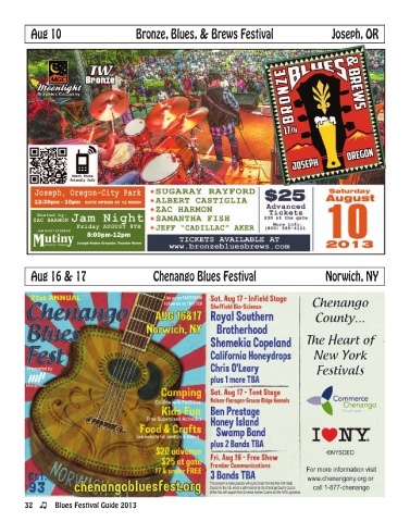 Aug 10 Bronze, Blues, & Brews Festival Joseph, OR Aug 16 & 17 Chenango Blues Festival Norwich, NY 32 Blues Festival Guide 2013