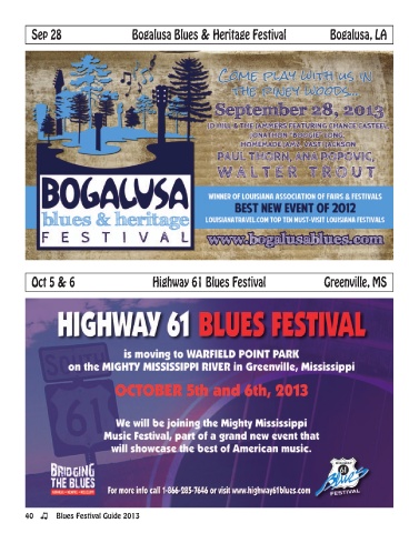 Sep 28 Bogalusa Blues & Heritage Festival Bogalusa, LA Oct 5 & 6 Highway 61 Blues Festival Greenville, MS 40 Blues Festival Guide 2013