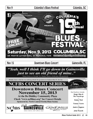 Nov 9 Columbia’s Blues Festival Columbia, SC Nov 15 Downtown Blues Concert Gainesville, FL Blues Festival Guide 2013 45