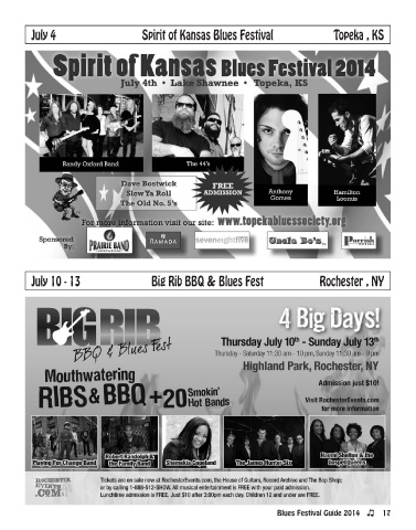 July 4 Spirit of Kansas Blues Festival topeka , KS July 10 - 13 Big rib BBQ & Blues Fest rochester , Ny Blues Festival Guide 2014 17