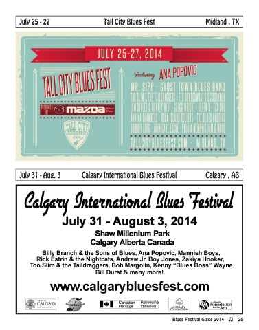 July 25 - 27 tall city Blues Fest midland , tX July 31 - aug. 3 calgary international Blues Festival calgary , aB Blues Festival Guide 2014 25