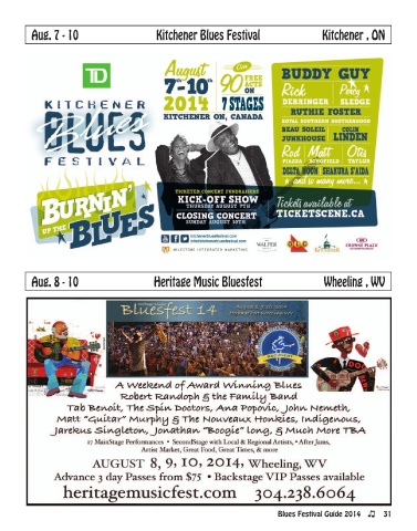 aug. 7 - 10 Kitchener Blues Festival Kitchener , oN aug. 8 - 10 heritage music Bluesfest Wheeling , Wv Blues Festival Guide 2014 31