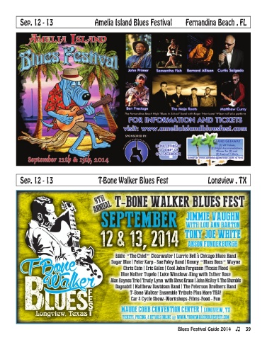 Sep. 12 - 13 amelia island Blues Festival Fernandina Beach , Fl Sep. 12 - 13 t-Bone Walker Blues Fest longview , tX Blues Festival Guide 2014 39
