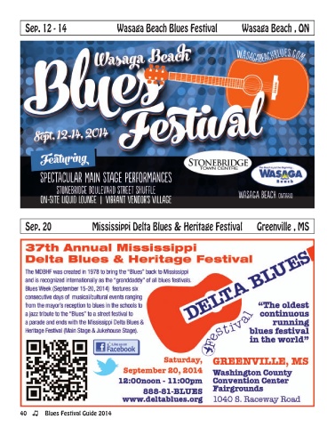 Sep. 12 - 14 Wasaga Beach Blues Festival Wasaga Beach , oN Sep. 20 mississippi Delta Blues & heritage Festival Greenville , mS 40 Blues Festival Guide 2014