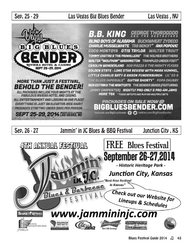 Sep. 25 - 29 las vegas Big Blues Bender las vegas , Nv Sep. 26 - 27 Jammin’ in Jc Blues & BBQ Festival Junction city , KS Blues Festival Guide 2014 43