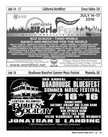 July 14 - 17 california WorldFest Grass valley, ca July 16 roadhouse BluesFest Summer Music Festival Magnolia, De Blues Festival Guide 2016 19