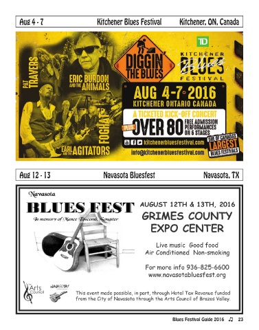 aug 4 - 7 Kitchener Blues Festival Kitchener, oN, canada aug 12 - 13 Navasota Bluesfest Navasota, tX Blues Festival Guide 2016 23