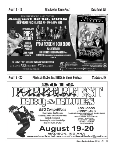 aug 12 - 13 Waukesha BluesFest Delafield, WI aug 19 - 20 Madison ribberfest BBQ & Blues Festival Madison, IN Blues Festival Guide 2016 27