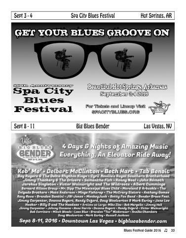 Sept 3 - 4 Spa city Blues Festival hot Springs, ar Sept 8 - 11 Big Blues Bender las vegas, Nv Blues Festival Guide 2016 33