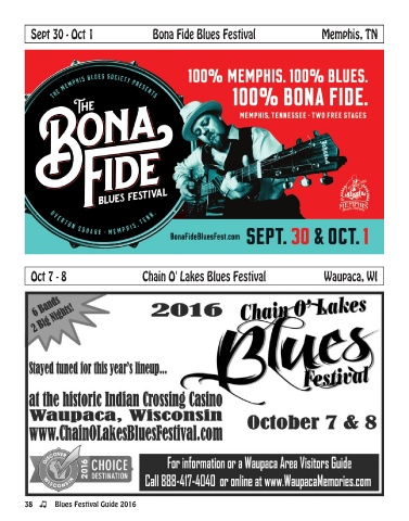 Sept 30 - oct 1 Bona Fide Blues Festival Memphis, tN oct 7 - 8 chain o' lakes Blues Festival Waupaca, WI 38 Blues Festival Guide 2016