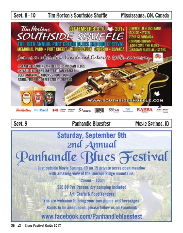 Sept. 8 - 10 Tim Horton's Southside Shuffle Mississauga, ON, Canada Sept. 9 Panhandle Bluesfest Moyie Springs, ID 36 Blues Festival Guide 2017