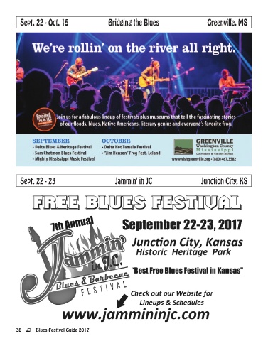 Sept. 22 - Oct. 15 Bridging the Blues Greenville, MS Sept. 22 - 23 Jammin' in JC Junction City, KS 38 Blues Festival Guide 2017