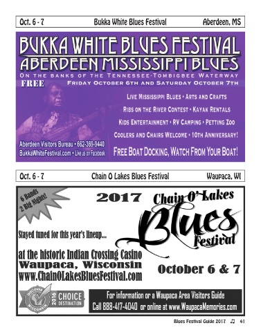 Oct. 6 - 7 Bukka White Blues Festival Aberdeen, MS Oct. 6 - 7 Chain O Lakes Blues Festival Waupaca, WI Blues Festival Guide 2017 41