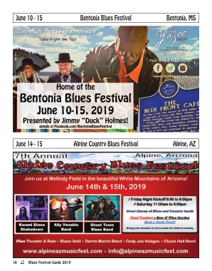 June 10 - 15 Bentonia Blues Festival Bentonia, MS June 14 - 15 Alpine Country Blues Festival Alpine, AZ 10 Blues Festival Guide 2019