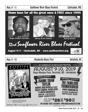 Aug. 9 - 11 Sunflower River Blues Festival Clarksdale, MS Aug. 9 - 10 Waukesha Blues Fest Delafield, WI Blues Festival Guide 2019 25