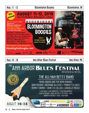 Aug. 11 - 12 Bloomington Boogies Bloomington, IN Aug. 16 - 18 Ann Arbor Blues Festival Ann Arbor, MI 26 Blues Festival Guide 2019