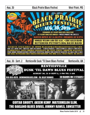 Aug. 30 Black Prairie Blues Festival West Point, MS Aug. 30 - Sept. 2 Rentiesville Dusk 'Til Dawn Blues Festival Rentiesville, OK Blues Festival Guide 2019 31