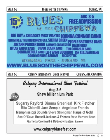 Aug 3-5 Blues on the Chippewa Durand, WI Aug 3-6 Calgary International Blues Festival Calgary, AB, CANADA Blues Festival Guide 2023 13