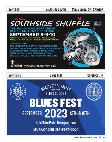 Sept 8-10 Southside Shuffle Mississauga, ON, CANADA Sept 15-16 Blues Fest Davenport, IA Blues Festival Guide 2023 21