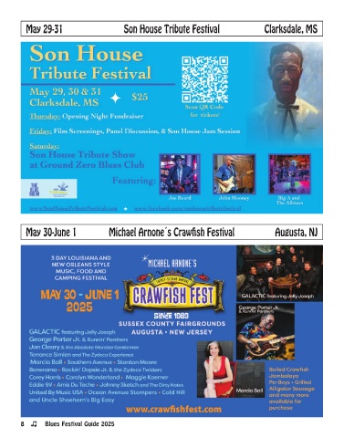 May 29-31 Son House Tribute Festival Clarksdale, MS May 30-June 1 Michael Arnone´s Crawfish Festival Augusta, NJ 8 Blues Festival Guide 2025