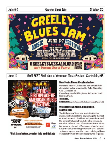 June 6-7 Greeley Blues Jam Greeley, CO June 14 BAM FEST Birthplace of American Music Festival Clarksdale, MS Blues Festival Guide 2025 9