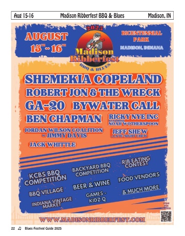 Aug 15-16 Madison Ribberfest BBQ & Blues Madison, IN x x x 22 Blues Festival Guide 2025