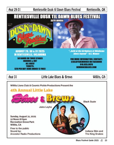 Aug 29-31 Rentiesville Dusk til Dawn Blues Festival Rentiesville, OK Aug 31 Little Lake Blues & Brews Willits, CA Blues Festival Guide 2025 23