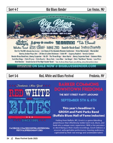 Sept 4-7 Big Blues Bender Las Vegas, NV Sept 5-6 Red, White and Blues Festival Fredonia, NY 24 Blues Festival Guide 2025