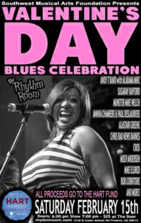 (PHOENIX, AZ) – Southwest Musical Arts Foundation presents a Valentine’s Hart Fund Show on Saturday, February 15 at the Rhythm Room in Phoenix, AZ. Every year around Valentine’s Day the Rhythm Room hosts a Benefit for the Blues Foundation’s HART Fund. The fund helps Blues musicians with medical, dental and funeral expenses and holds many proactive health screening events throughout the year. It’s an unbelievable night of music, really more like a full-blown festival in the iconic club in Phoenix.