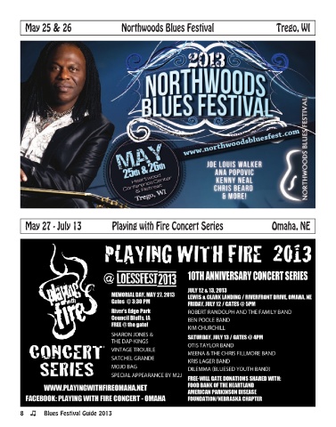 May 25 & 26 Northwoods Blues Festival Trego, WI May 27 - July 13 Playing with Fire Concert Series Omaha, NE 8 Blues Festival Guide 2013