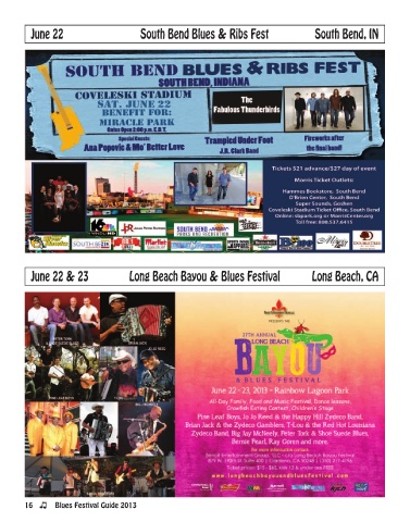 June 22 South Bend Blues & Ribs Fest South Bend, IN June 22 & 23 Long Beach Bayou & Blues Festival Long Beach, CA 16 Blues Festival Guide 2013