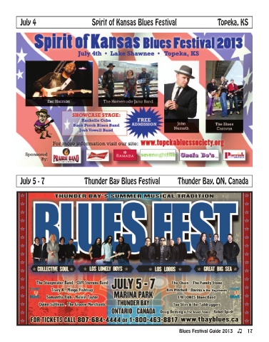 July 4 Spirit of Kansas Blues Festival Topeka, KS July 5 - 7 Thunder Bay Blues Festival Thunder Bay, ON, Canada Blues Festival Guide 2013 17