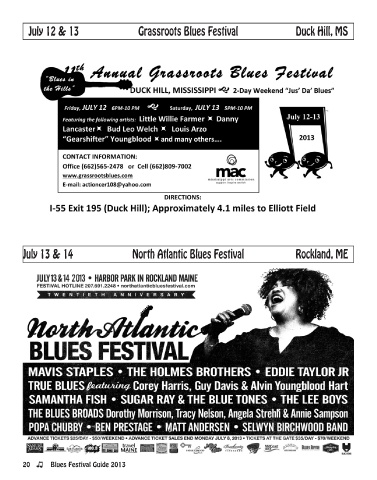 July 12 & 13 Grassroots Blues Festival Duck Hill, MS July 13 & 14 North Atlantic Blues Festival Rockland, ME 20 Blues Festival Guide 2013