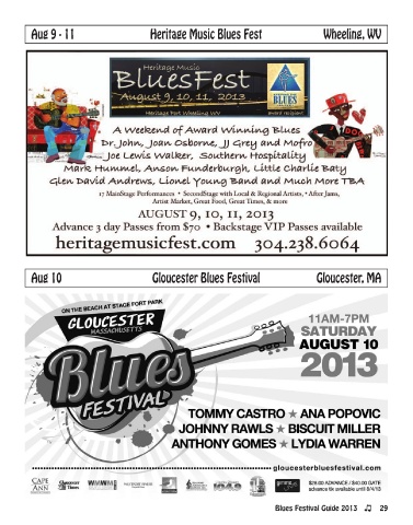 Aug 9 - 11 Heritage Music Blues Fest Wheeling, WV Aug 10 Gloucester Blues Festival Gloucester, MA Blues Festival Guide 2013 29