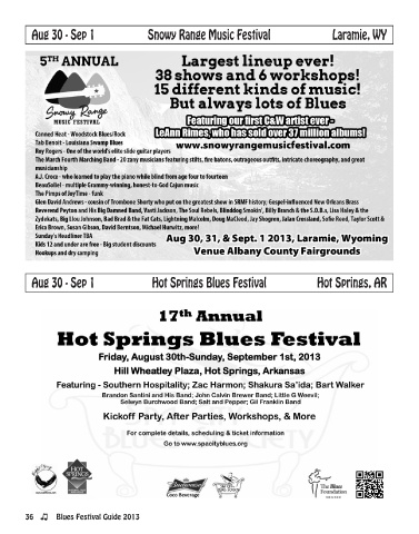 Aug 30 - Sep 1 Snowy Range Music Festival Laramie, WY Aug 30 - Sep 1 Hot Springs Blues Festival Hot Springs, AR 36 Blues Festival Guide 2013